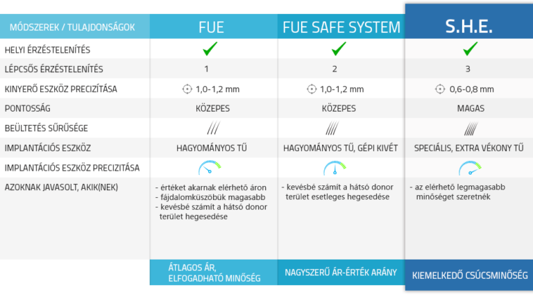 A módszerek közötti különbség leglényegesebb pontja az eszközök méretében rejlik. Az S.H.E. hajbeültetés során a lehető legapróbb eszközökkel végezzük a hajszálak kinyerését és beültetését, aminek köszönhetően a FUE hajbeültetések eredményénél dúsabb, természetesebb hajbeültetési eredmény érhető el, ugyanis a vékony eszközökkel egymáshoz közelebb ültethetők a hajszálegységek, azaz graftok.